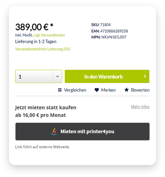 Mit unserer API können Sie innerhalb weniger Minuten einen „Mieten mit printer4you“-Button auf Ihren Drucker-Artikelseiten integrieren.